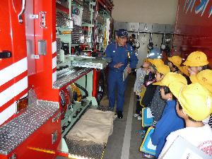 三郷消防署では、消防車や救急車、レスキュー車などを見せていただき、すごい設備に驚いていました。