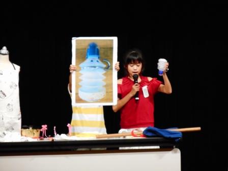 夏休みに取り組んだ発明創意工夫展。代表児童の作品を発表しました。食器などを洗う時に便利になるもの、電車に乗る時に便利になるつり革が発表