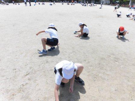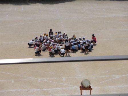 Jアラート全国一斉情報伝達訓練を実施しました。運動会練習をしていた5・6年生はすばやく、真ん中に集まっていました。