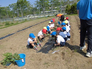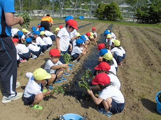 地域の方に耕していただいた学校ファームに、苗植えを行いました。さつまいも、なす、トマトなどを植えました。