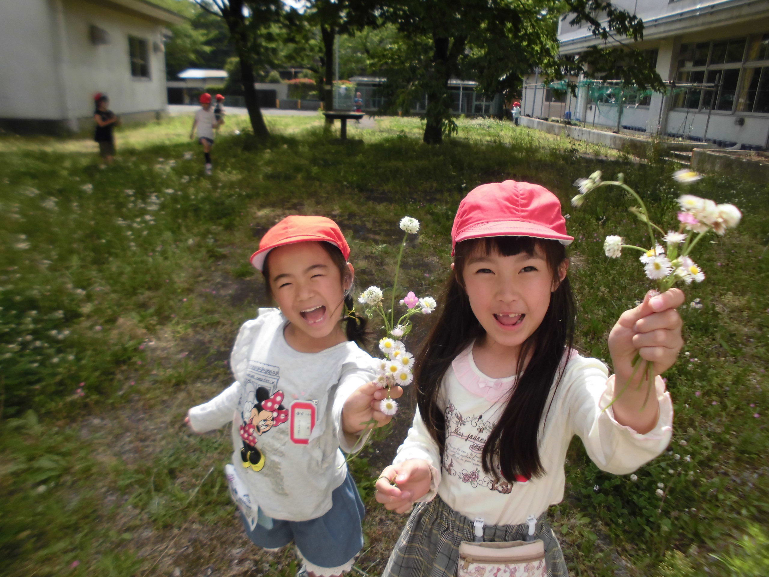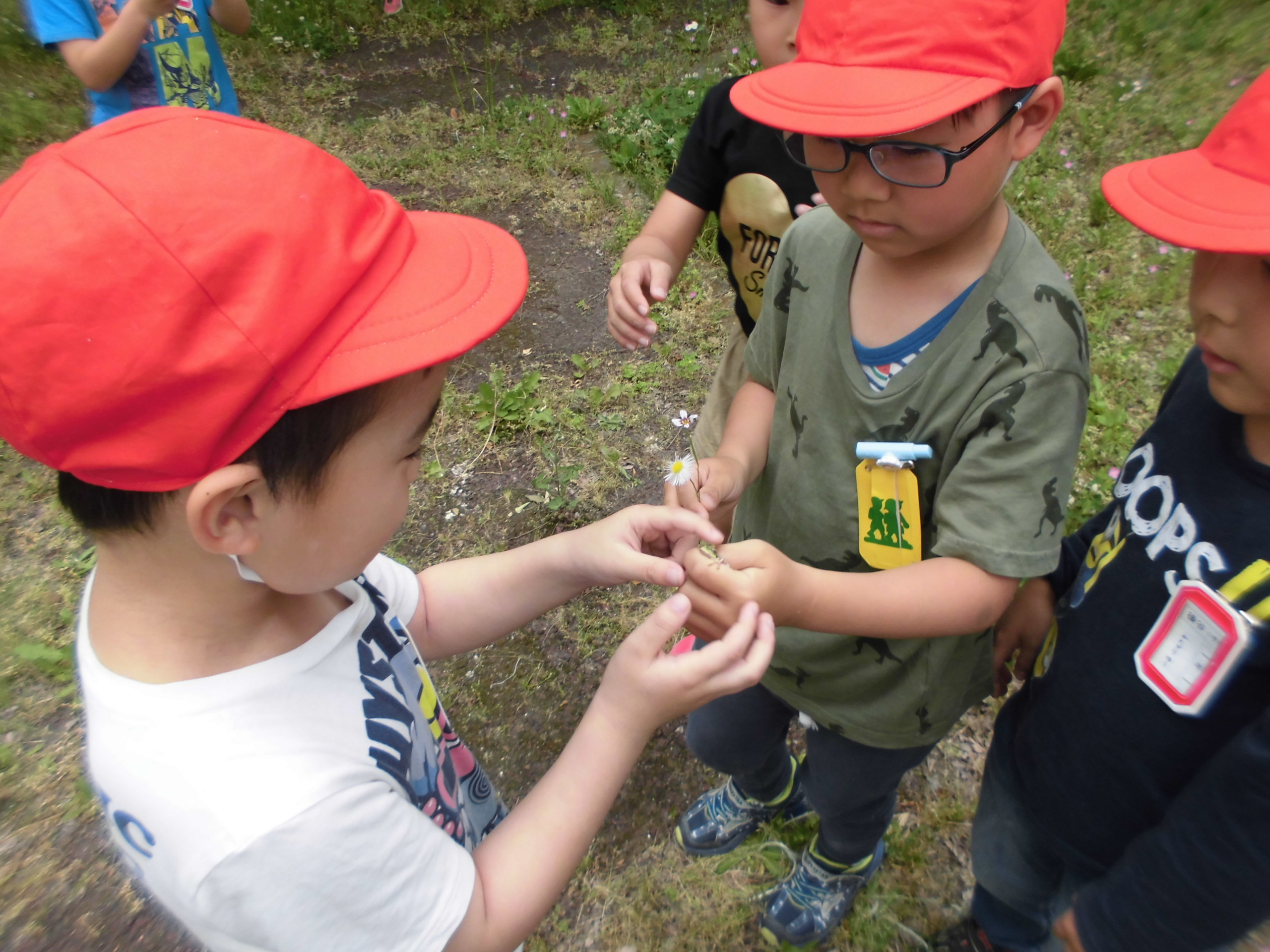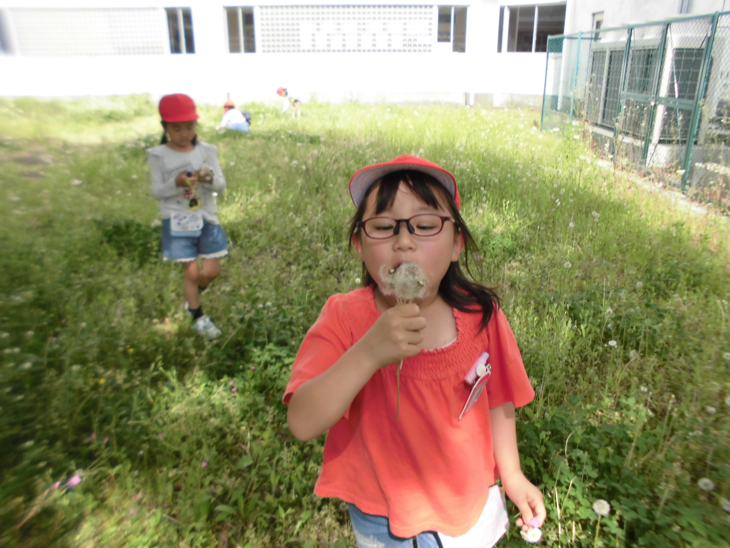 みんなでわたげを飛ばしたり、シロツメクサの指輪を作ったり、花束を作ったりしました。四つ葉のクローバーを見つけて、幸せな気持ちになりました、