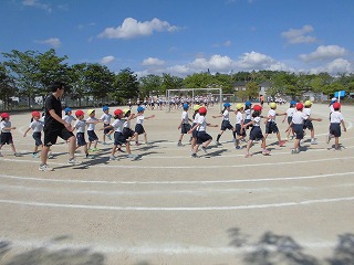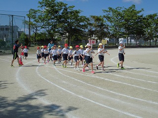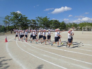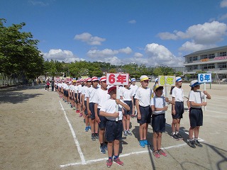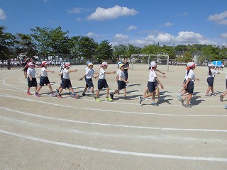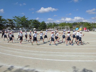 運動会練習が始まっています。今日は、入場行進練習の第一回目。まだ、そろっていません。通るコースの確認を行いました。