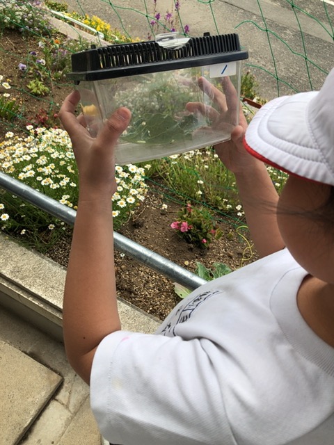「先生、見てください!」と、自分の手元のあおむしの様子を説明してくれる児童も。