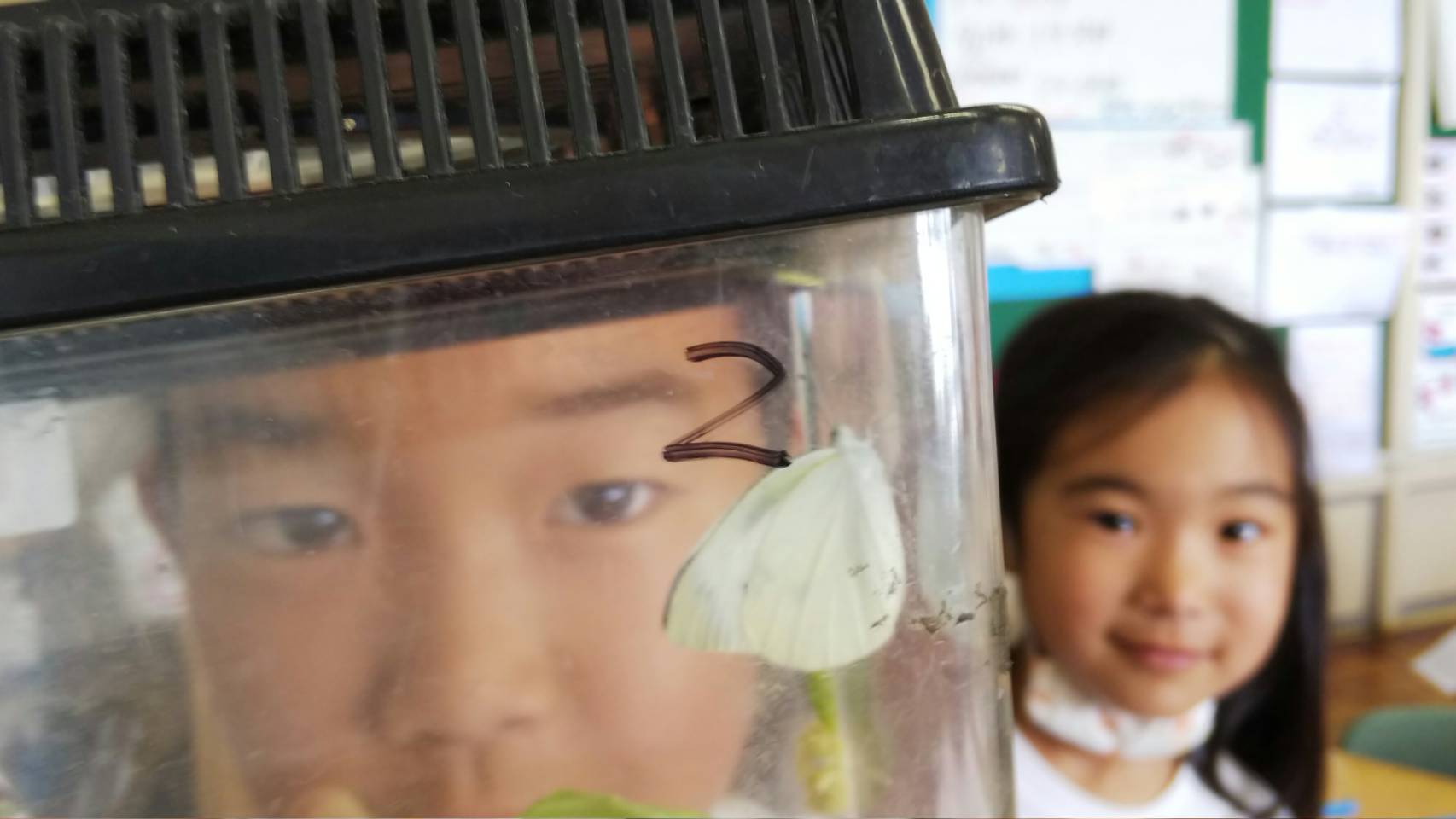 虫かごの向こうから、じーっと見つめる真剣な表情。