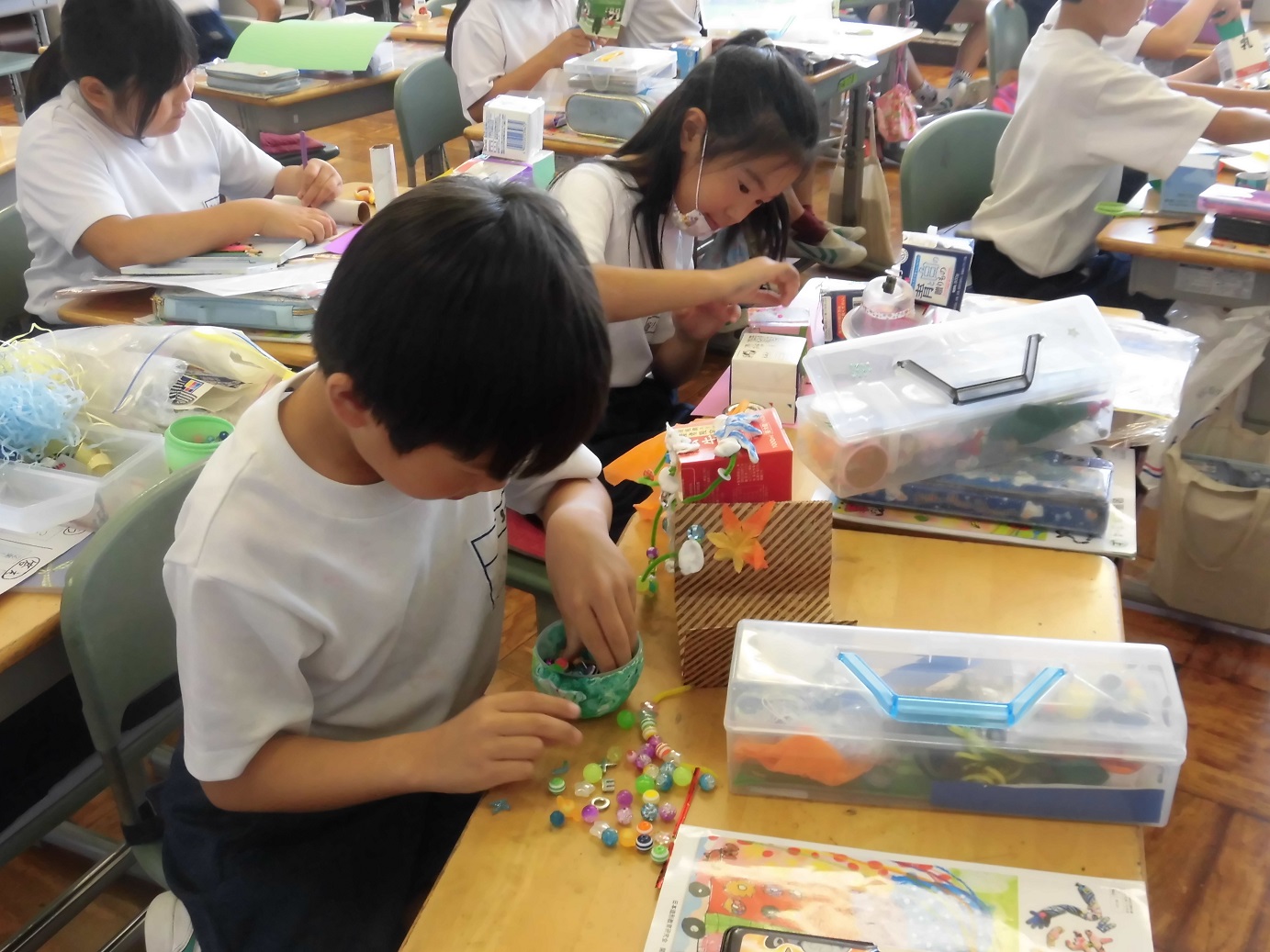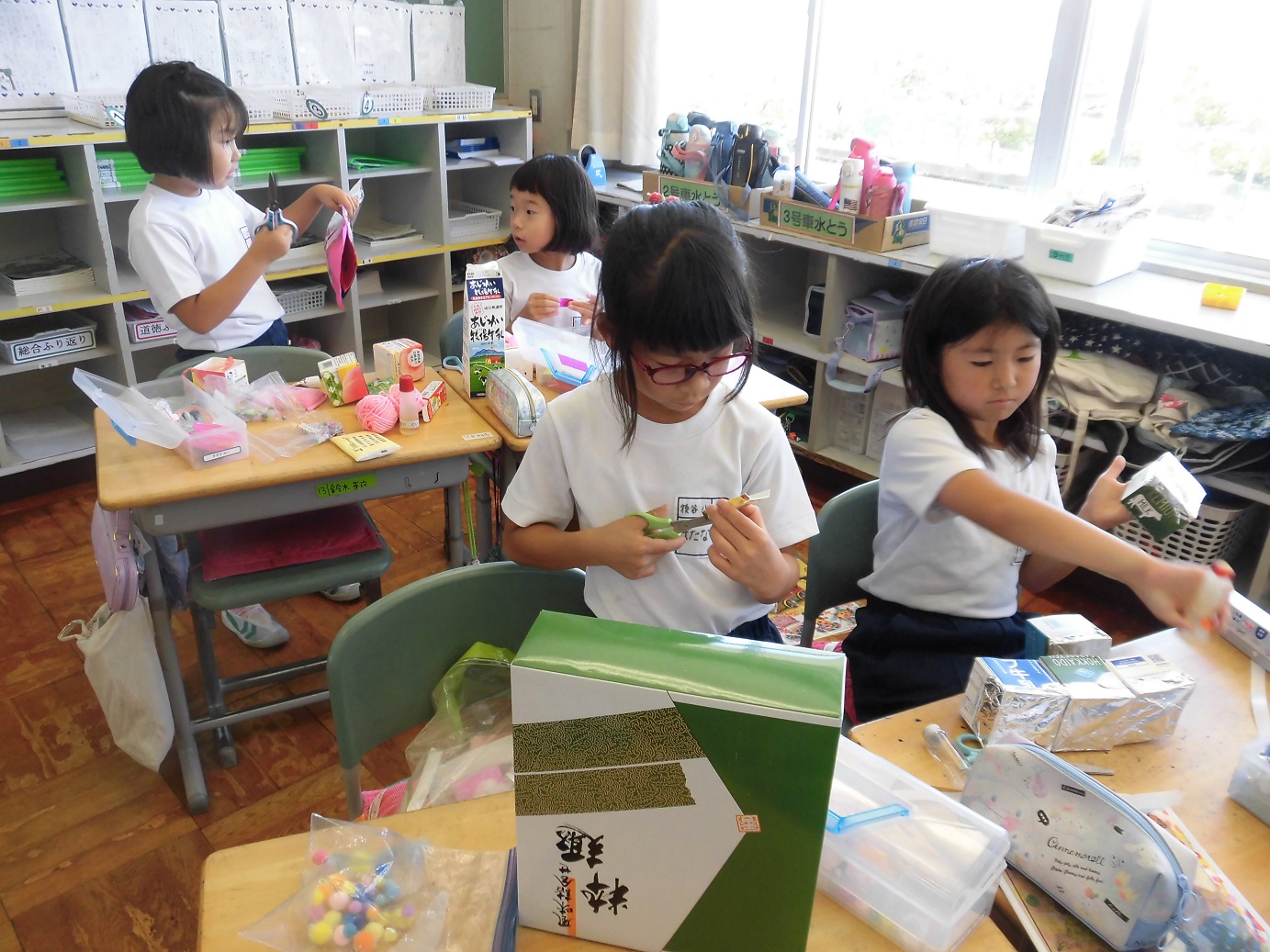 3年生は、図画工作の時間に牛乳パックを使って、「小さな箱の物語」を作成していました。全員、集中して取り組めています。