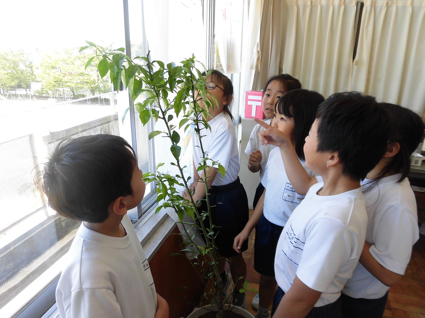 3年生の教室には、アゲハチョウの幼虫がいます。全員、幼虫の様子を真剣に見ていました。大きくなるのが楽しみですね。