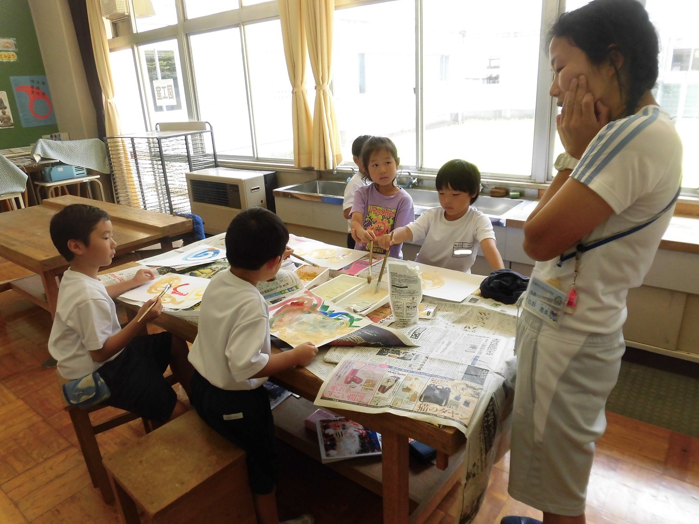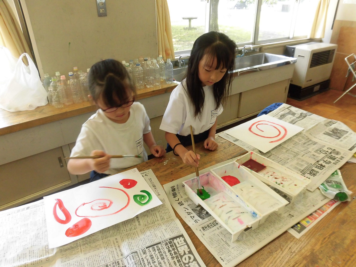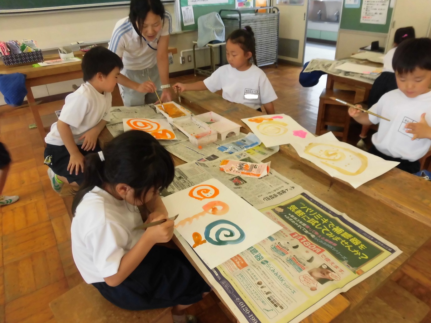 1年生が図工室で、絵具を使っていました。絵筆の使い方を練習しています。「くるくる」と描いています。うまくできたかな?