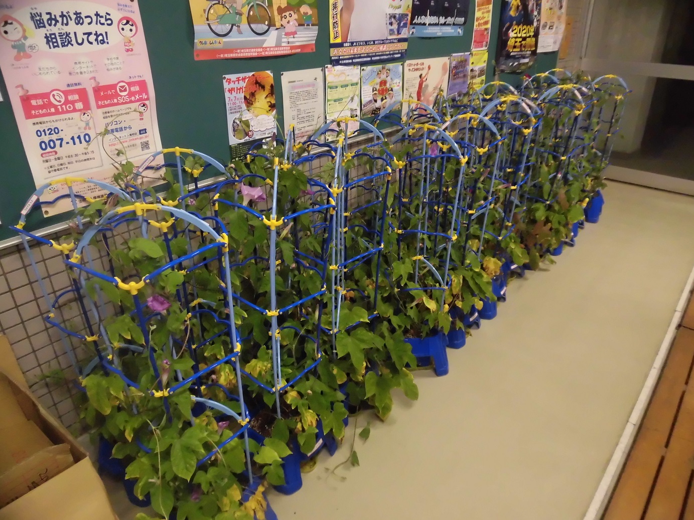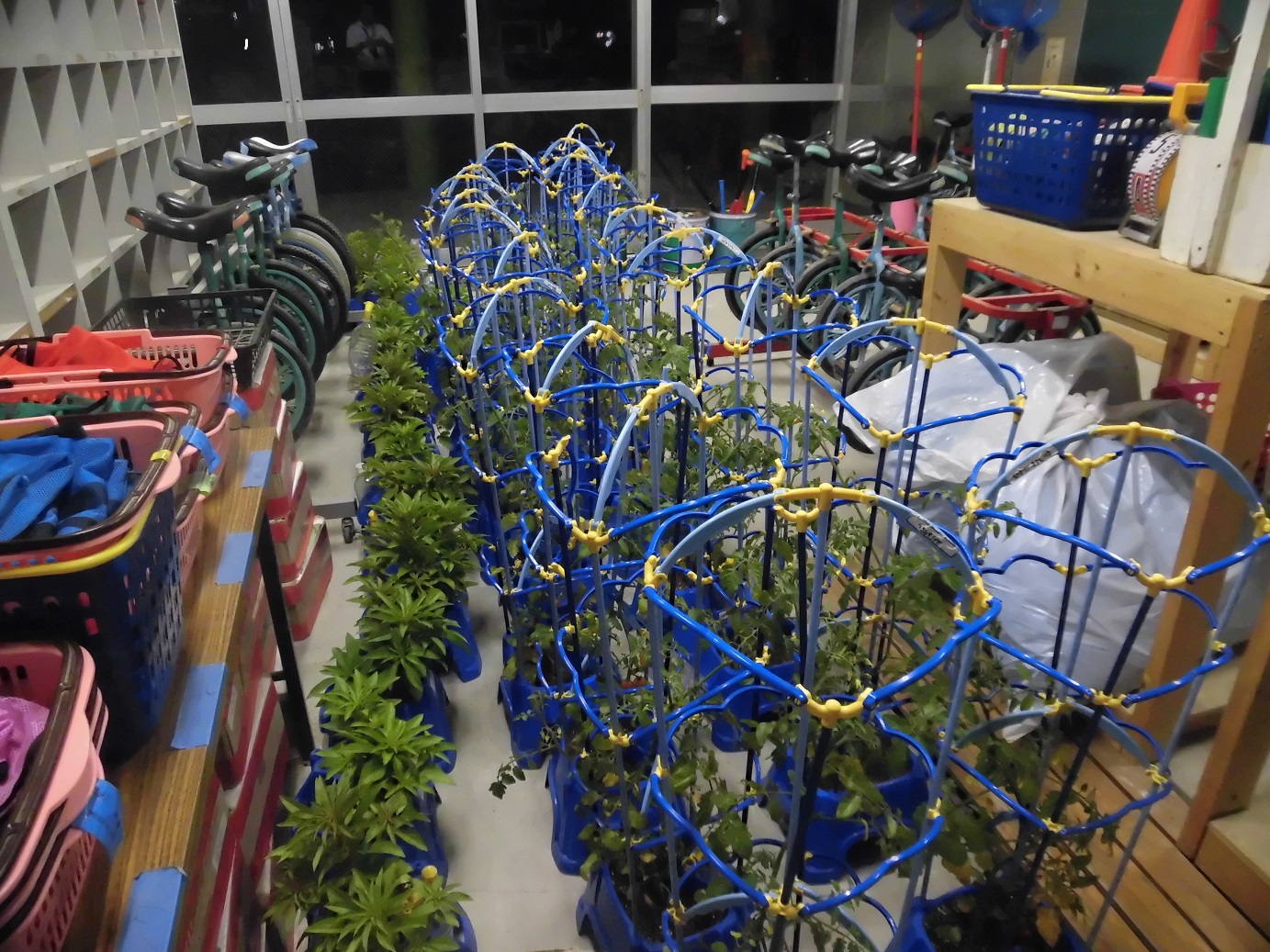 本日の夜からの強い雨に備え、朝顔、ホウセンカ、ミニトマトの鉢を室内にしまっています。後谷小は万全です。