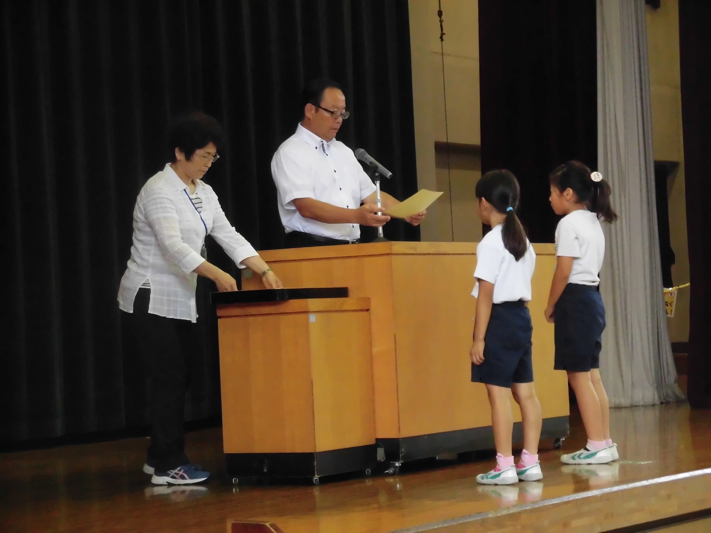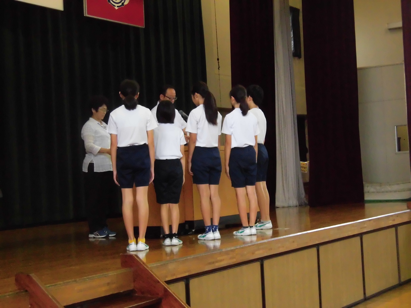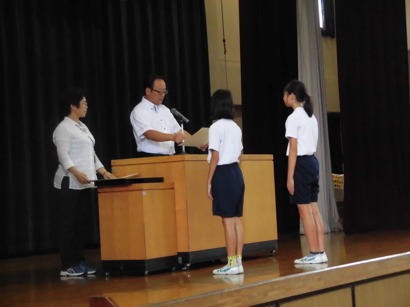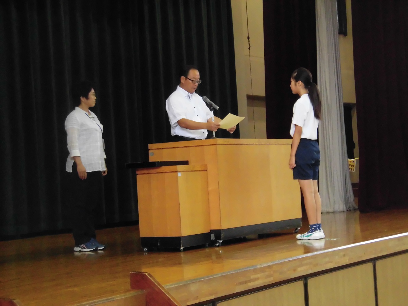 本日の朝は表彰朝会です。校内硬筆展、人権作文、自転車乗り大会、青少年の主張についての表彰が行われました。受賞者の皆さん、おめでとうございます。大変立派な態度でした。