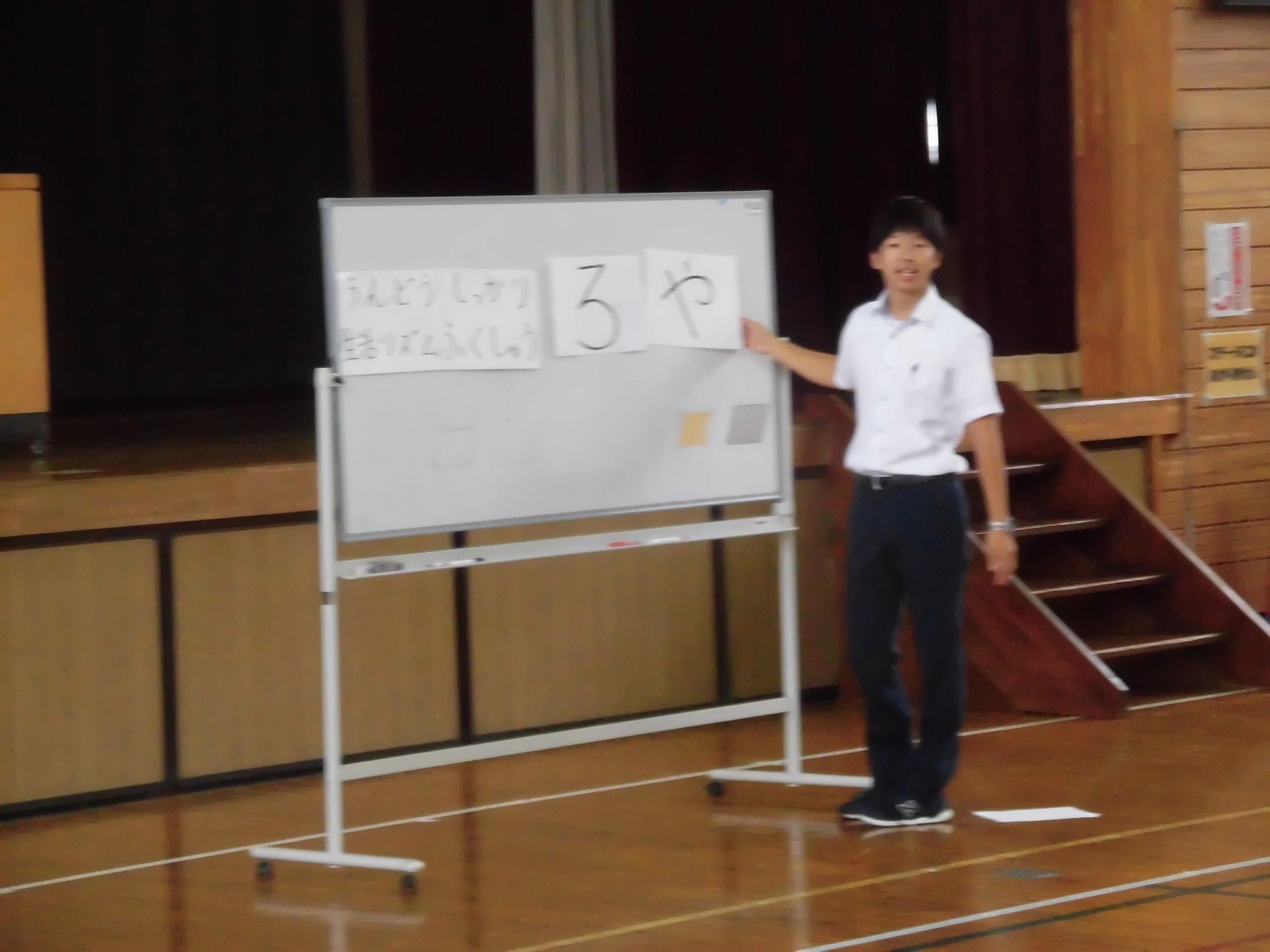 生徒指導担当から、夏休みのすごし方について話がありました。「うしろや」にあわせて、う(うんどうする)、し(しっかりふくしゅうする)、ろ(3つの感動)、や(やくそくを守る 特に交通ルール)というお話でした。後谷小の皆さん、話の内容を理解して充実した夏休みにしましょう。
