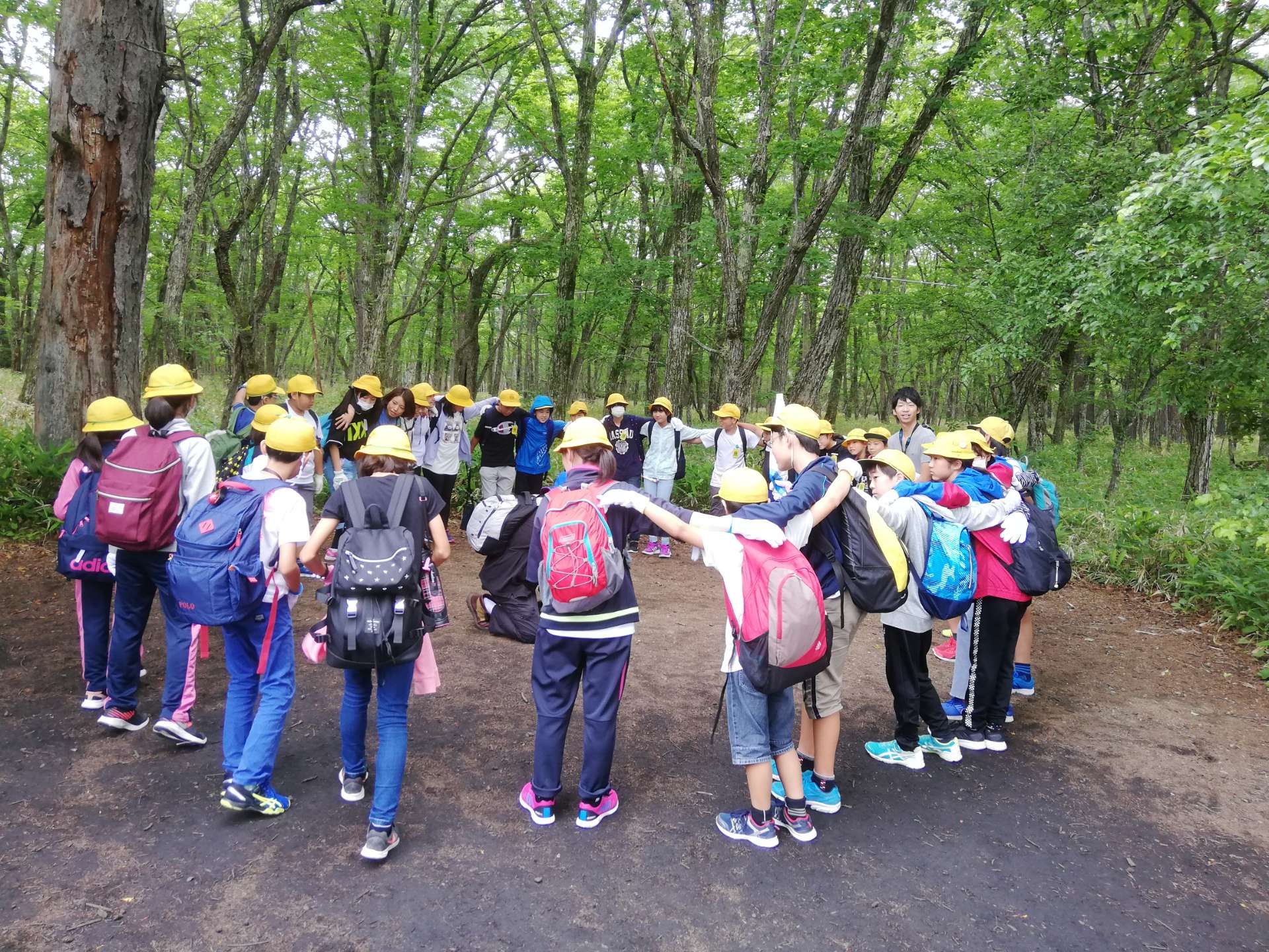これからハイキング開始です。最後まで歩けるよう円陣を組んで励まし合っています。頑張れ、6年生!
