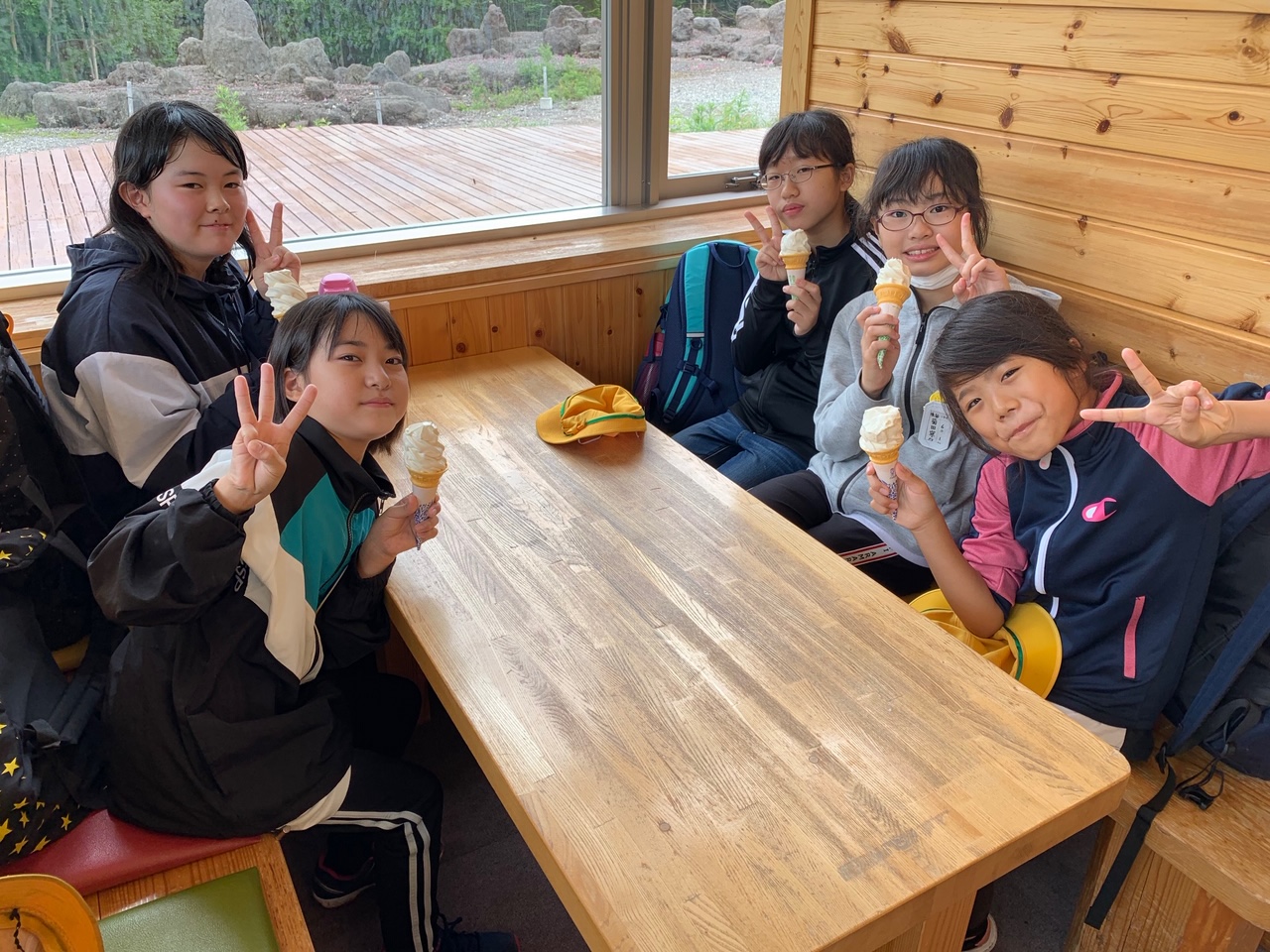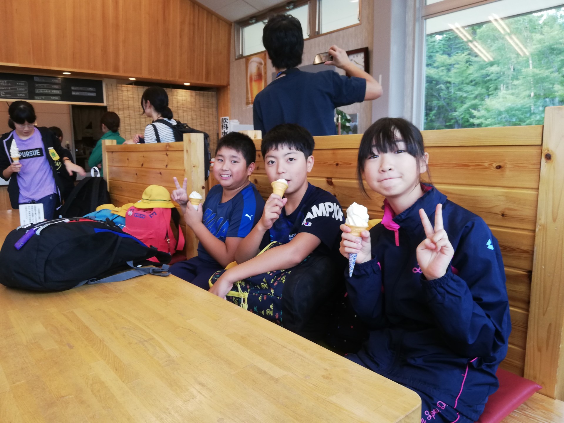 全員でソフトクリームを食べています。ハイキングの後ですから、格別の味でしょうね。