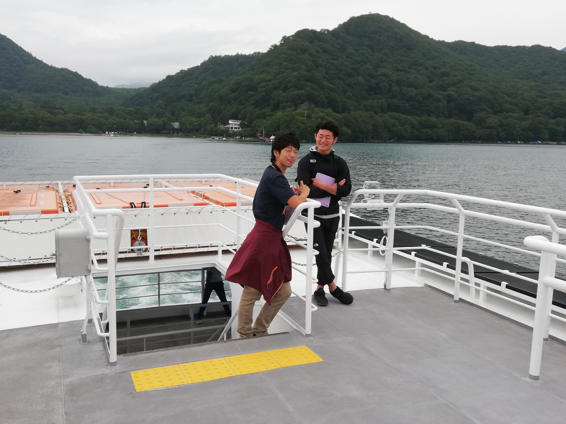 遊覧船での先生の様子です。本当に気持ちよさそうですね。2人の仲もさらに深まりました。
