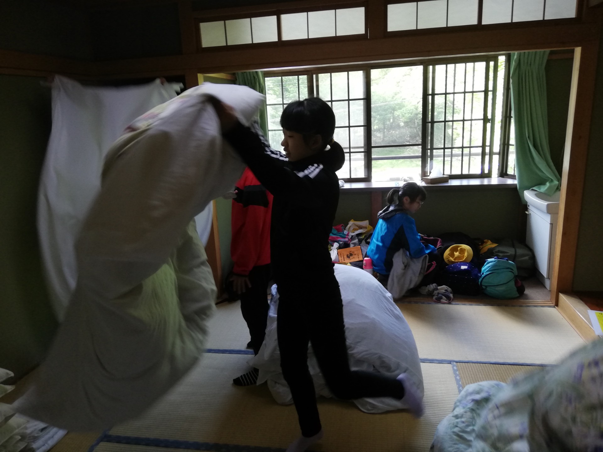 布団を片付けています。3日間お世話になった宿をきれいにしましょう。「来た時よりも美しく」できるかな?