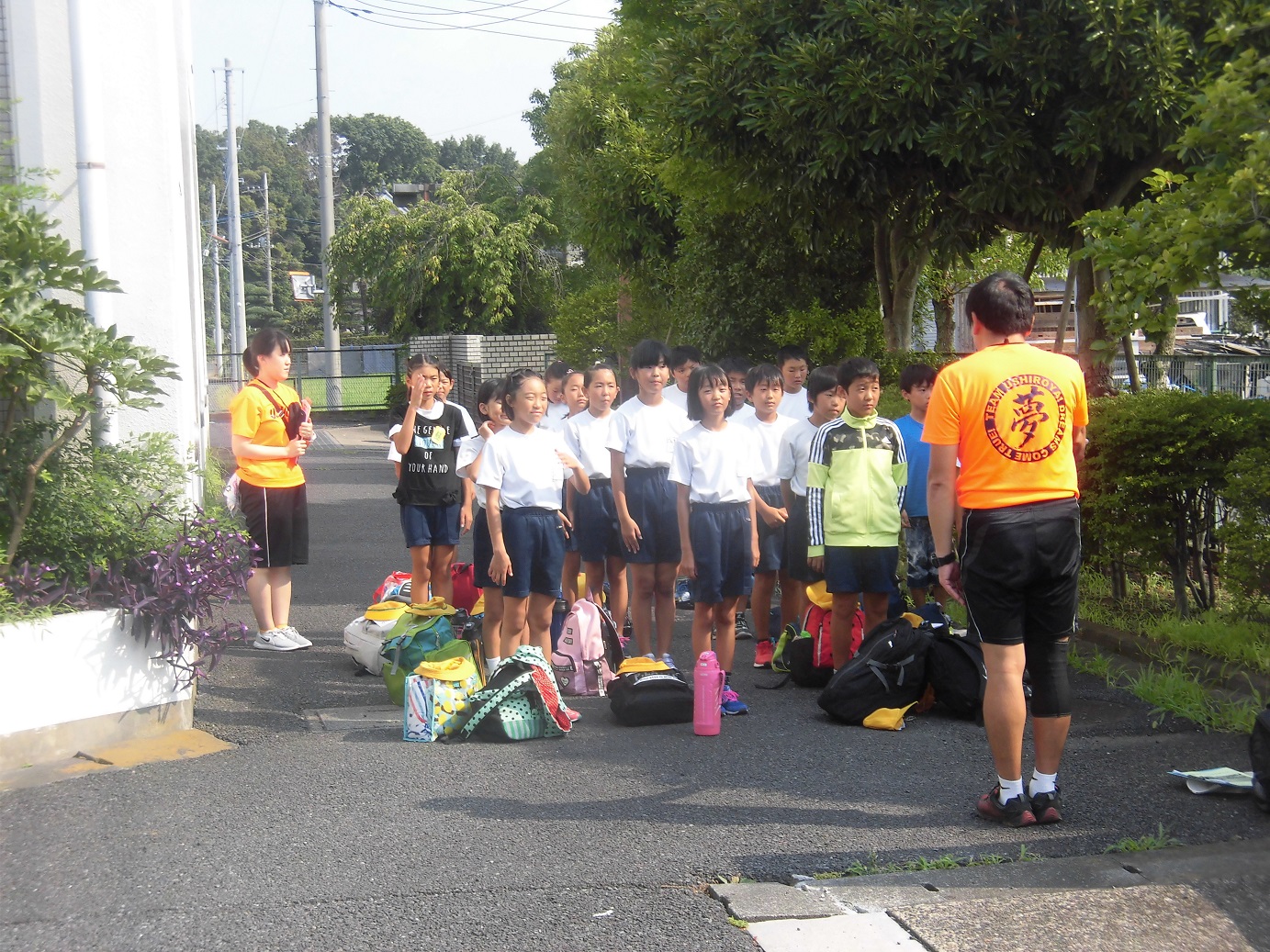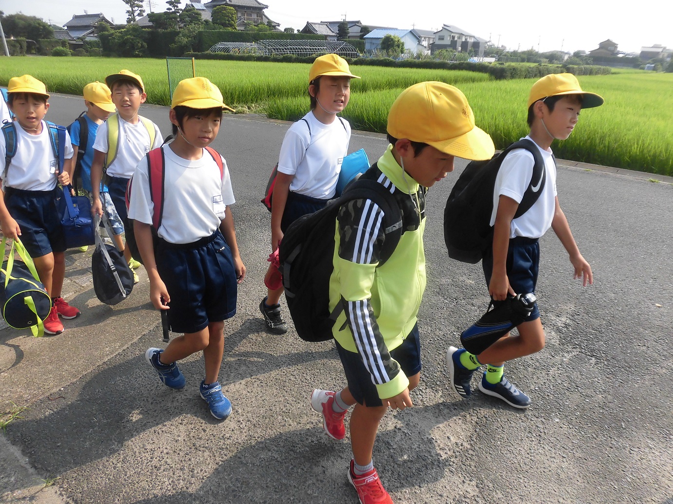 水泳大会に参加するため、5年生が集合し、学校を出発しました。目指せ、自己ベスト!