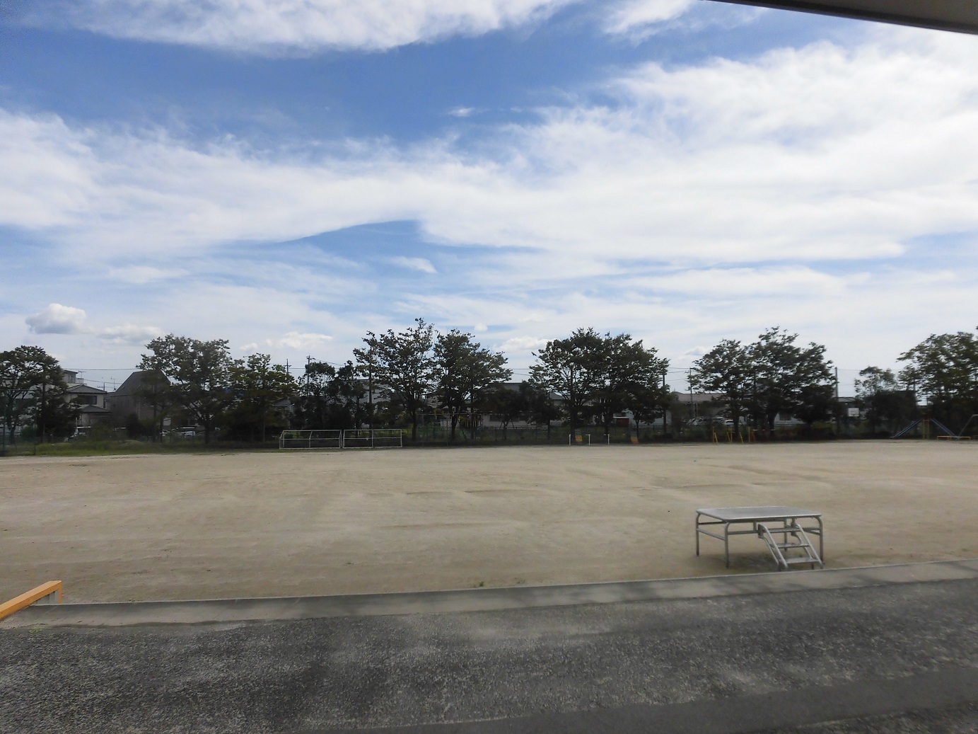 午前中の台風が去り、午後は気持ちよく晴れました。気温は約30度でした。少し蒸し暑いです。校庭もすっかり乾きました。