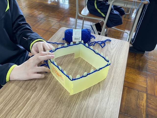 家庭科の授業の様子です。毛糸を使って編み物を行っています。どんな作品が出来るのか仕上がりが楽しみです!!