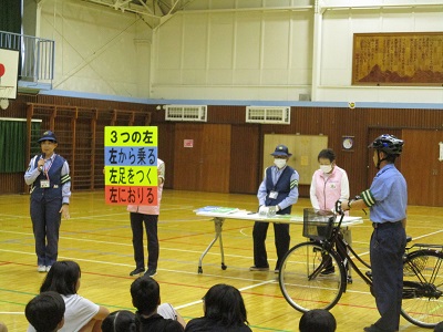 低中学年だけでなく、5年生も交通安全教室を2時間目に、体育館で実施しました。5年生の子供たちの交通安全に特に関連する、安全な自転車の乗り方を中心にご指導をいただきました。