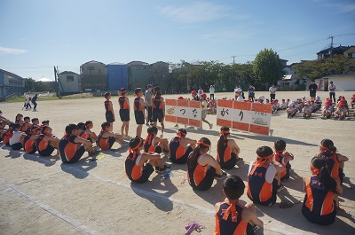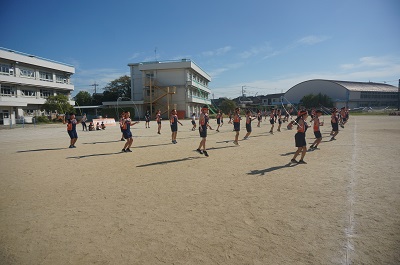 秋晴れの下、陸上記録会に向けた選手壮行会を、代表委員会のメンバーの運営でおはようタイムの時間に開催しました。