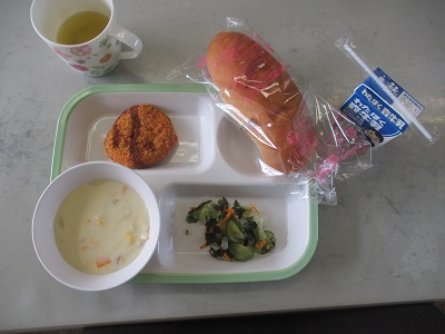 この運動をするための源の一つである給食ですが、今日のメニューは戸ケ崎小6年生男子児童のリクエストメニューでした。コッペパン、牛乳、メンチカツ、クラムチャウダー、わかめサラダです。