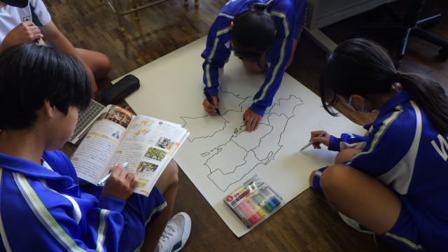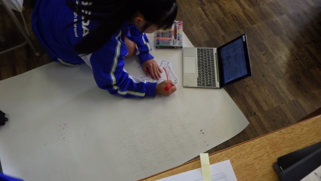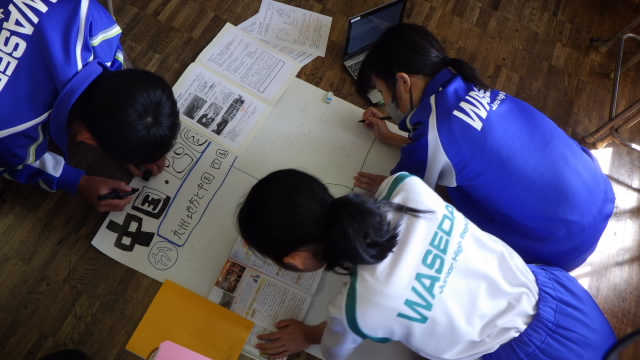 社会の授業の様子です。班で分かれて模造紙学習を行っています。