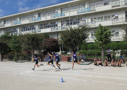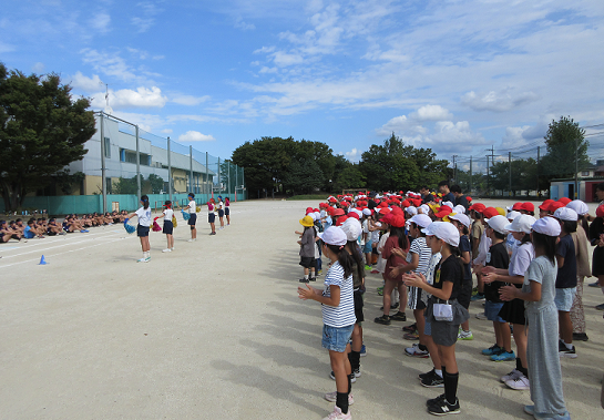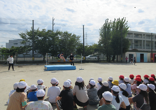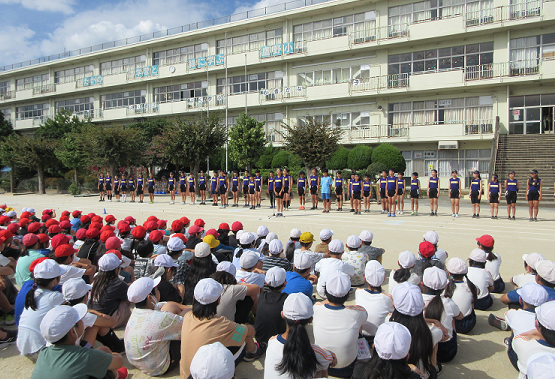 今日は、陸上記録会の壮行会を行いました。全校児童から選手のみなさんに熱いエールが送られました。選手の紹介の後、実際に選手のみなさんに競技を披露してもらいました。80m走、走り高跳び、走り幅跳び、ボール投げ、リレー、縄跳びのどの種目も大変素晴らしく、大きな拍手をもらいました。リレーは、男女ともベスト記録を出すことができました。選手のみなさん、今までの練習の成果を充分に発揮してください!