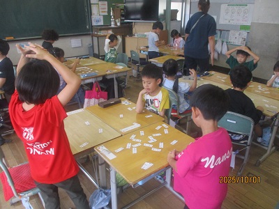 例えば、1年生では、計算カードを使って3、4人のグループで、カルタ取りの要領で計算の学習に取り組みました。