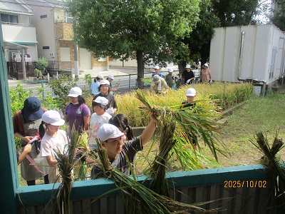 5年生は、今日の2、3時間目に稲刈りをしました。指導してくださる皆さんは、民生委員の方など地域のボランティアの方々です。