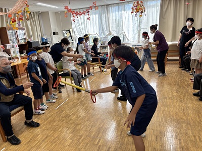 4年生は総合的な学習の時間の学習活動の一環で、クラスごとに戸ケ崎地区にある高齢者の方々の福祉施設を訪問しています。2回目の訪問ですが、入所者の方々と顔見知りになり交流も深まってきています。