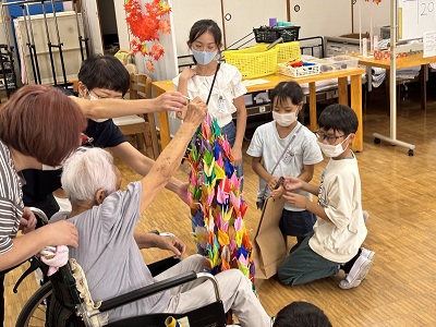 今日の訪問では、ゲームなどでの交流のほかに、ご長寿を祈念して作成した折り鶴プレゼントしました。温かく素敵な時間が過ごせました。
