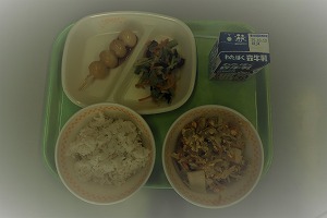 本日の給食は、親子丼の具、麦ご飯、和風サラダ(柚子かつお)、牛乳、月見団子でした。今日の「中秋の名月」にちなんでの給食です!