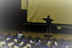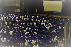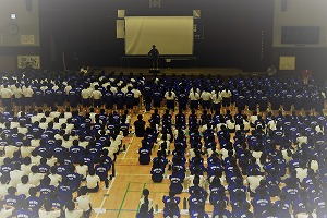 また5時間目には、全校生徒が体育館に集まり、「校歌」と全校合唱曲「夢の世界を」の練習を行いました。3年生全員の歌声を1,2年生に聞いてもらう場面では、歌い終わった後に自然に拍手が送られるなど、真剣に取り組む中にも温かさの漂う時間となりました。