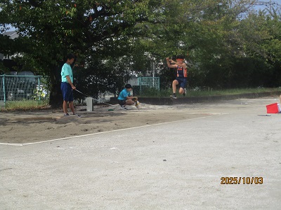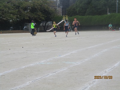 午前8時前には、近隣3校陸上記録会の準備が整っていましたので、会場となる校庭を見ながら登校してくる在校生の朝のあいさつが、いつもより元気でした。