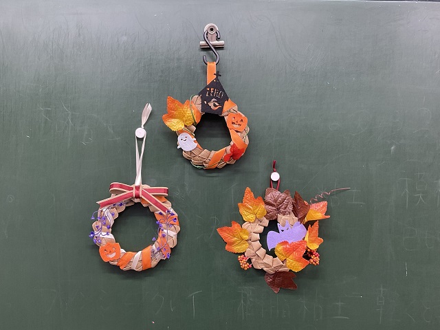美術の時間に紙バンドを使ってリース作りを行いました。ハロウィン飾りもつけて、上手に仕上がりました!!