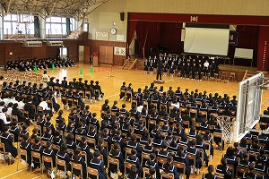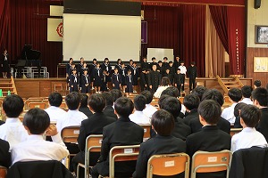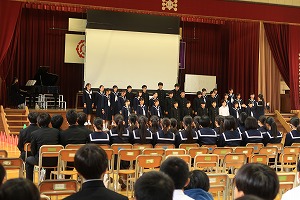 合唱コンクールを来週に控えて、1・2年生では中間発表を行いました。各クラスが合唱曲の一番だけを合唱し、動きの確認も行いました。