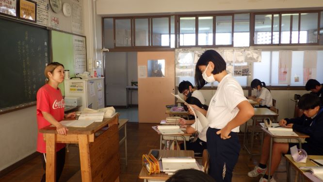 今日の英語はリテリング(教科書のストーリーを自分の言葉で伝える活動) のためのリーディング練習をしました。