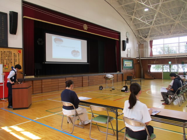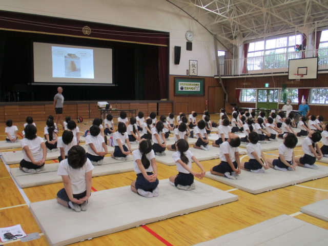授業では、市内でトレーナーをしている木津様をお招きして、姿勢と運動能力について実技を交えながら教えていただきました。参観の保護者の皆様も一緒に体を動かしてくださり、親子で考えるよい機会となったのではないでしょうか。